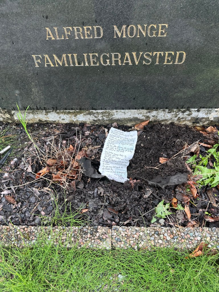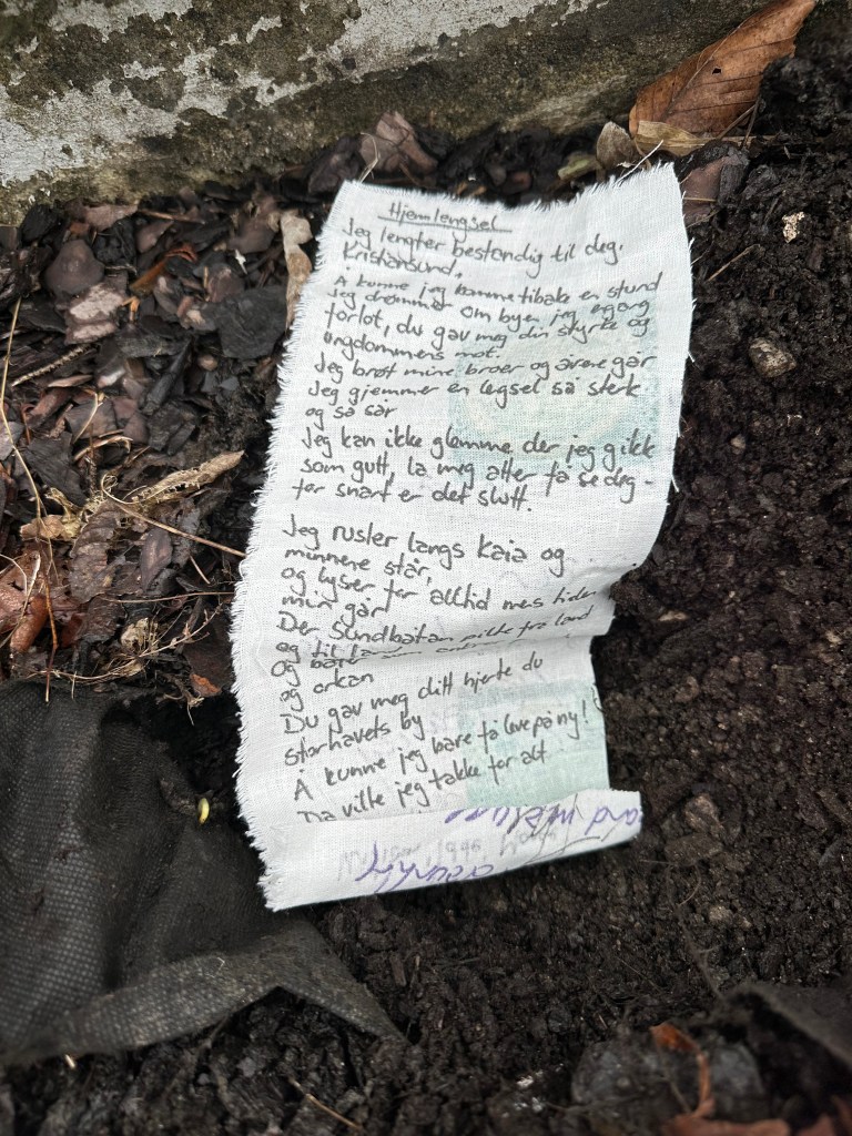 The final, and a very poignant aspect of the project, was to reunite Bestefar with his family, at the family grave. His parents and siblings are all laid to rest here, together, and as an act of forgiveness he was reunited with his family. Bestefar wrote a song about his hometown, and how he longed to go back if he could find the courage. It was written just before he died. He never went back. Until now. I buried a piece of organic hemp fabric, the same material as the flags were made from. The lyrics of the song was written on it. As the fabric decompose it will blend with the soil that holds his ancestors’ remains. In front of the gravestone I placed another stone with his image and the dates of his birth and death, an alternative gravestone to signify his spiritual return to his family, and the town he never wanted to leave.