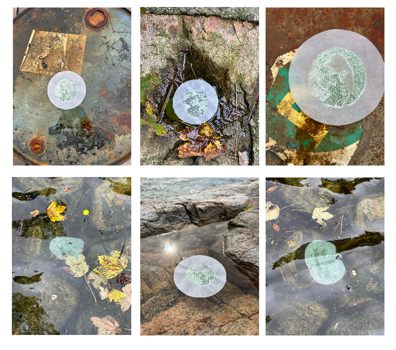 The paper portraits were placed in water to utilise the highly absorbent quality of the papers themselves. Initially they floated on the surface, but as water permeated they became heavy and sank, fully immersed in the water whether a small puddle, a fountain or the sea. The paper will eventually dissolve leaving fragments of Bestefar free to float away in the sea, or blow away as the puddles dry up.