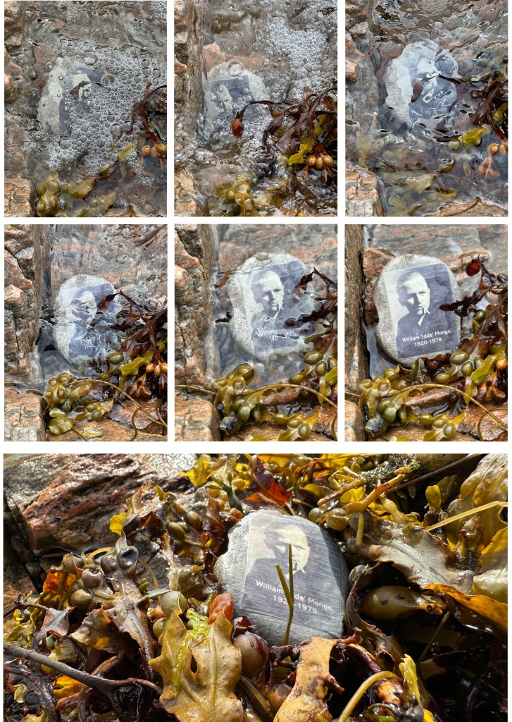 I brought two pebbles with me, both with an image of Bestefar. These tactile objects personified his spirit, they became him – I held the pebble and spoke to it as if it was Bestefar. As I gently placed the stone on the seaweed as the tide was coming in, I watched as the waves washed over his face, distorted it, moved the seaweed, and the stone. Every movement of the water changed the way he looked, distorted and restored his face, the moment of the waves dissolving his essence in the water.