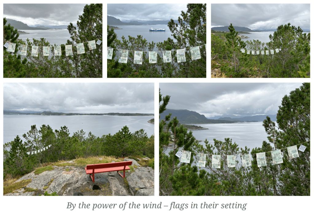 A coastal path. In the rain. If I had met anyone while walking, they would immediately have realised I was an “outsider” based on my outfit. Norwegians are always dressed for the weather when walking in nature; waterproof coats and solid boots are essential. I had trainers. And an umbrella. It felt awkward, laughable even; umbrellas don’t belong in the woods. Even I, as an urban dweller, know that. I felt like an outsider, unsure, not quite settled into my surroundings, not fully confident in my process of placing art in a public place. But the fork in the path was fortuitous; should I walk left or right? I chose right and ended up at “utsikten” – a viewing point where I immediately felt a sense of relief. And joy; the flags belonged here, in that specific spot. And with that, the project became alive, a joyous and immersive process, an exploration of the ancestral landscape.